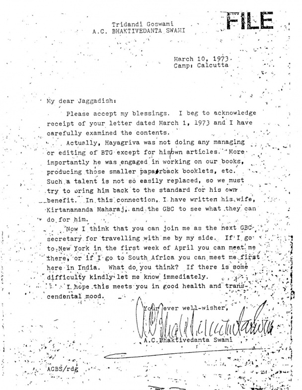 Ahora pienso que puedes unirte a mí como el próximo secretario del GBC para viajar conmigo a mi lado. Si voy a Nueva York en la primera semana de abril puedes encontrarme allí, o si voy a Sudáfrica puedes encontrarme primero aquí en India. ¿Qué piensas? Si hay alguna dificultad, por favor házmelo saber de inmediato.